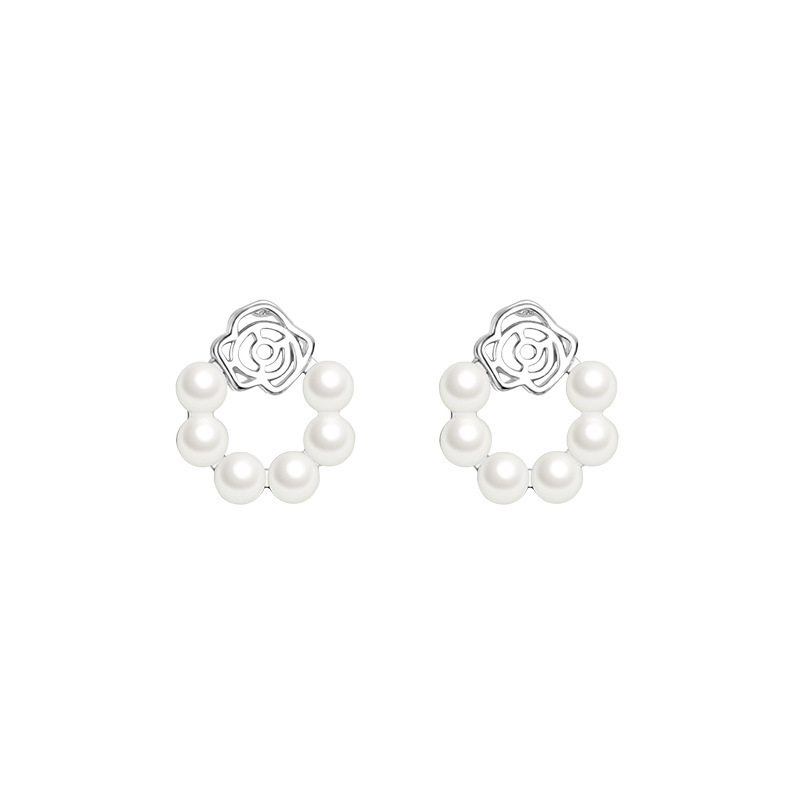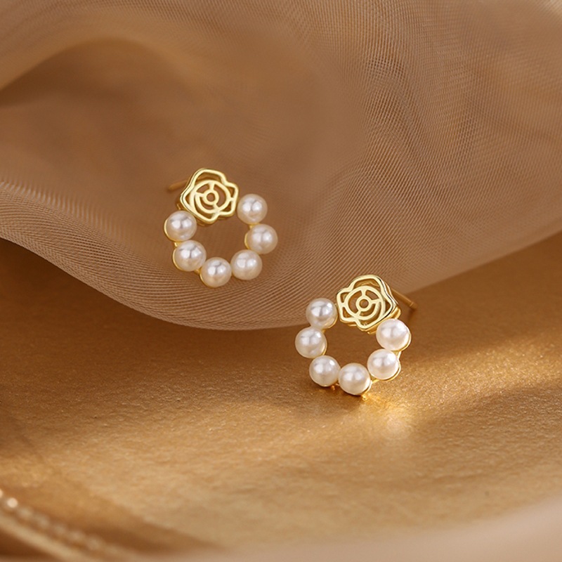 Korean Trendy Elegant Lady Hollow Rose Pearl Round Circle Stud Earrings For Fashion Sweet Cute Jewelry
